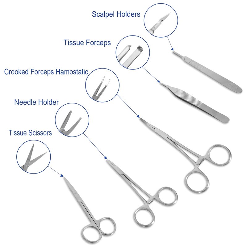- The suture kit includes surgical scissors, a needle holder, a crooked forceps hamostatic, tissue forceps, a scalpel handle, 5 scalpel blades, and 5 pieces of 4/0 nylon suture thread with needles.