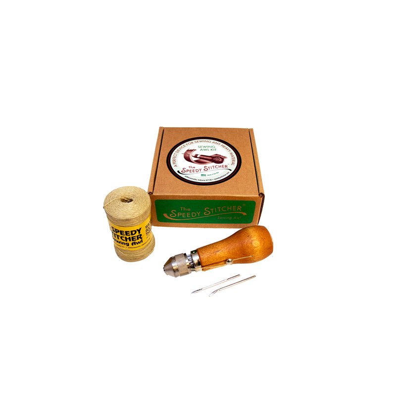 - Includes the genuine Speedy Stitcher Sewing Awl, 4 needles - 2 straight and 2 curved, and a 180-yd tube of coarse thread