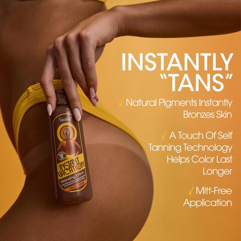 - SPF 30 PROTECTION: This tinted sunscreen contains broad spectrum SPF 30 made to adhere to the Hawaii 104 Reef Act. Instant Vacation SPF 30 bronzing lotion leaves skin feeling silky smooth with a moisturized glow while protecting against harmful UVA and UVB rays.