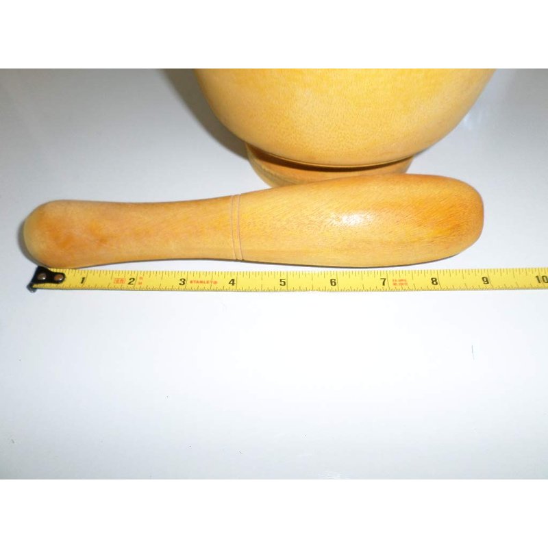this spice smasher wooden mortar and pestle is hand made out of wood and the mortar might not be perfectly round and the one you get might be little rough, since the factory do not have the packaging for this item, the one you get might have some handling dings or dents and scratch, this doesn't hurt anything on the use of this spice smasher. please refer to the pictures for more information. please wash thoroughly before use. the mortar bowl measure around 7 inch outside diameter and 5 inch inside diameter x around 2.5 inch inside depth and over high around 4.5 inch, the pestle measure around 8.5 inch long x around 1.5 inch large diameter and 1.25 in small end diameter with little concave for easy to hold when in use.