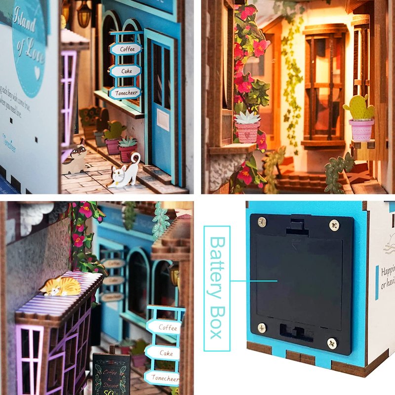 - 【PERFECT GIFT & COLLECTIBLE & DECOR】Creative and meaningful gift for Valentine's Day & birthday & Christmas to your friends, family and lover!Especially For those who love crafts, miniatures,and handmade,this is a perfect gift and collectible.More importantly,can cultivate their hands-on ability and creativity while enjoying the DIY fun!when you finish the booknook,More than just a simple book stand,its exquisite look and lights can be used as an ornament or artwork.