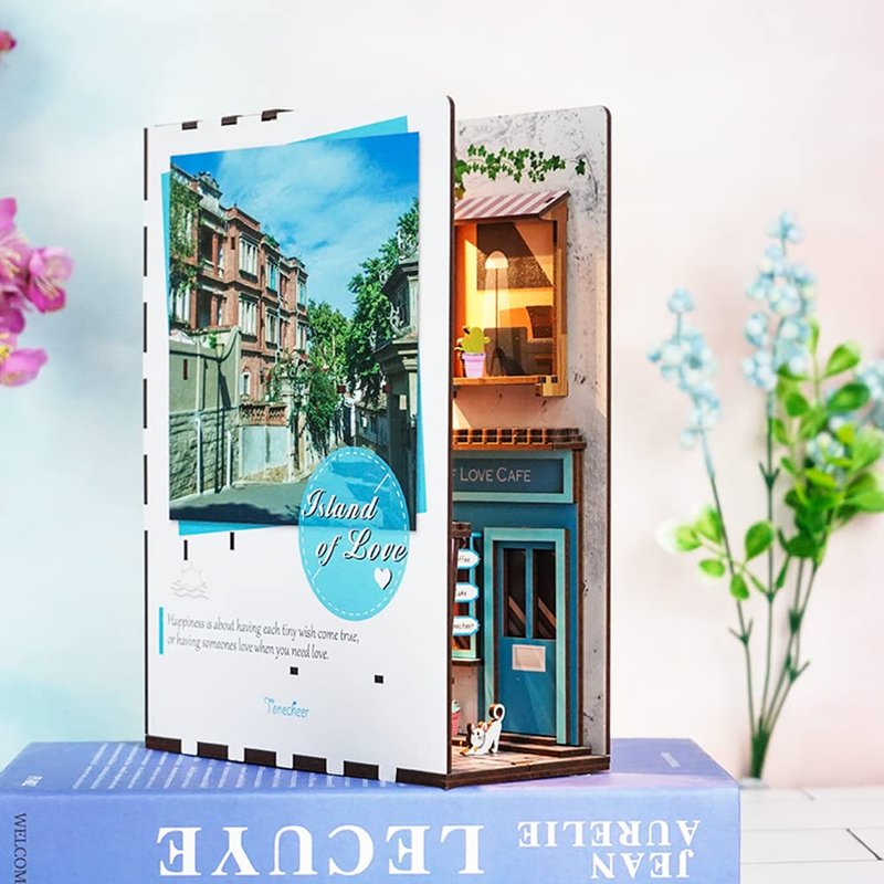 Spilay DIY Dollhouse Miniature Book Nook Assemble Kit,3D Wooden Puzzle Bookshelf Insert Decor with Sensor Light,Bookends Model Build-Creativity Kit for Adults Women Birthday Gift (Island of Love)