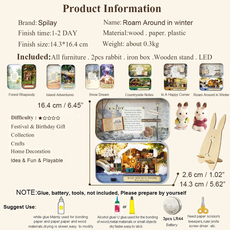- ♫♫♫【Important Notes】The dollhouse miniature have been checked 100% carefully before delivery to ensure that the accessories are complete and no missing part. Pls feel free to contact us if you have any questions when you assemble.We will solve any problems asap. Besides,you need to prepare silicone liquid glue and 3pcs batteries(type LR44) by yourself, because they are forbidden to ship by air transportation.