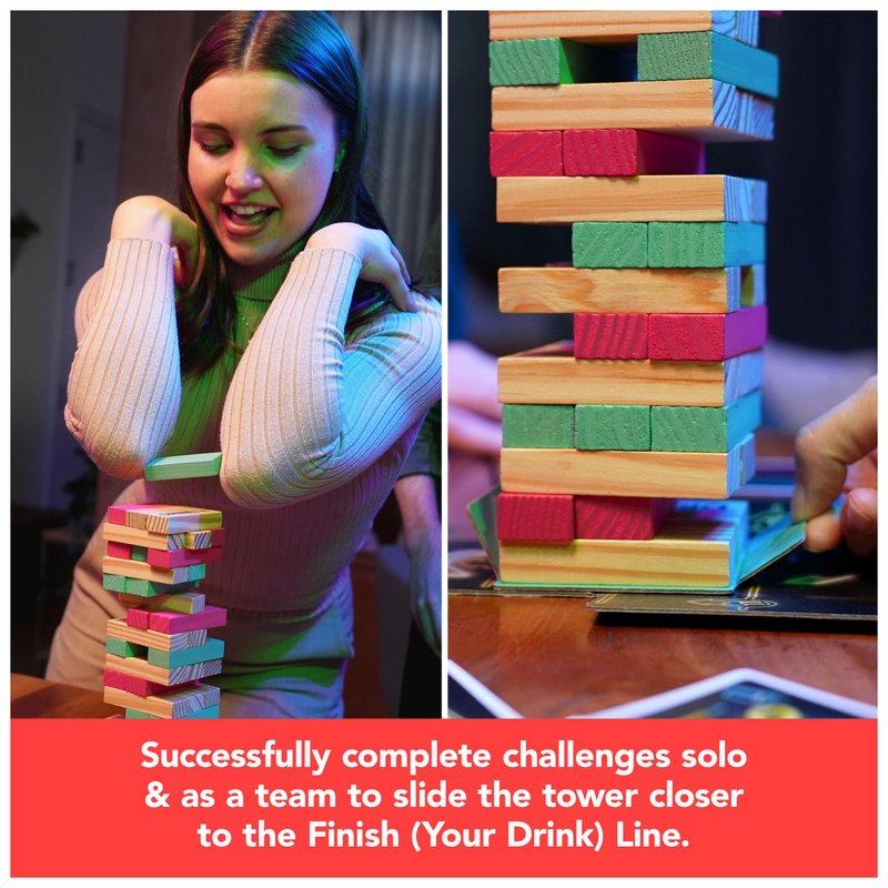 - TAKE ON THE TIPSY CHALLENGE: Carefully pull out and stack wooden blocks corresponding with hilarious challenge cards that go from easy to hard depending on the color Choose any beverage you like to play
