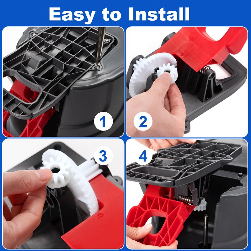 - Easy to install: Flip the mop bucket over, unscrew 4 screws on the mop bucket. Take off the foot pedal from the pail. Take off the worn-out gear sprocket. Put on the new one. Then re-install the foot pedal.