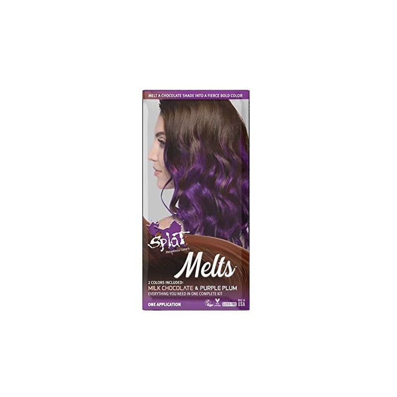 Melt a chocolate shade into a fierce bold color! Melts lets you express yourself by providing a complete kit with chocolate browns and vivid bolds to color melt unique, eye-catching looks. Melts gives you a rich long-lasting color and is formulated with Quinoa Extracts and Baobab Seed Oil for extra conditioning and strengthening. Melts is available in four chocolate brown and bold kits. A natural rich brown and bold purple shade with bleach, all in one kit to achieve unique color melt, eye-catching looks. Ideal for: Color melt, bold bangs or split dye styles. Chocolate Melts blend rich natural brown with a bold vibrant shade all in one kit. Splat Melts brings the best of two worlds together without having to go to the salon.