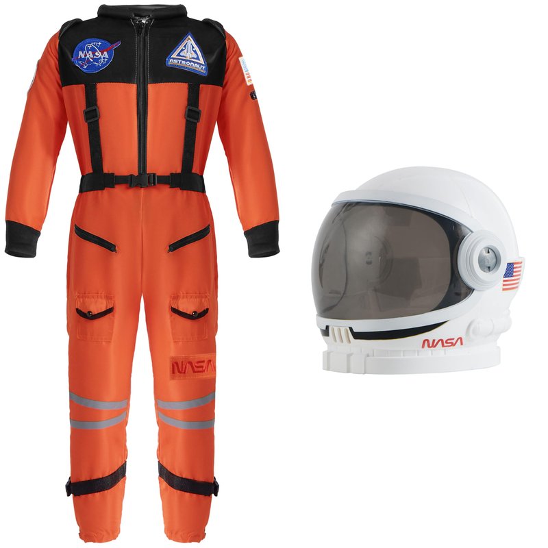 - Astronaut NASA Pilot Costume Includes a White Full-Length Body Jumpsuit with Embroidered NASA Logo and USA Flag Patches and a Tinted Movable Visor Space Helmet.