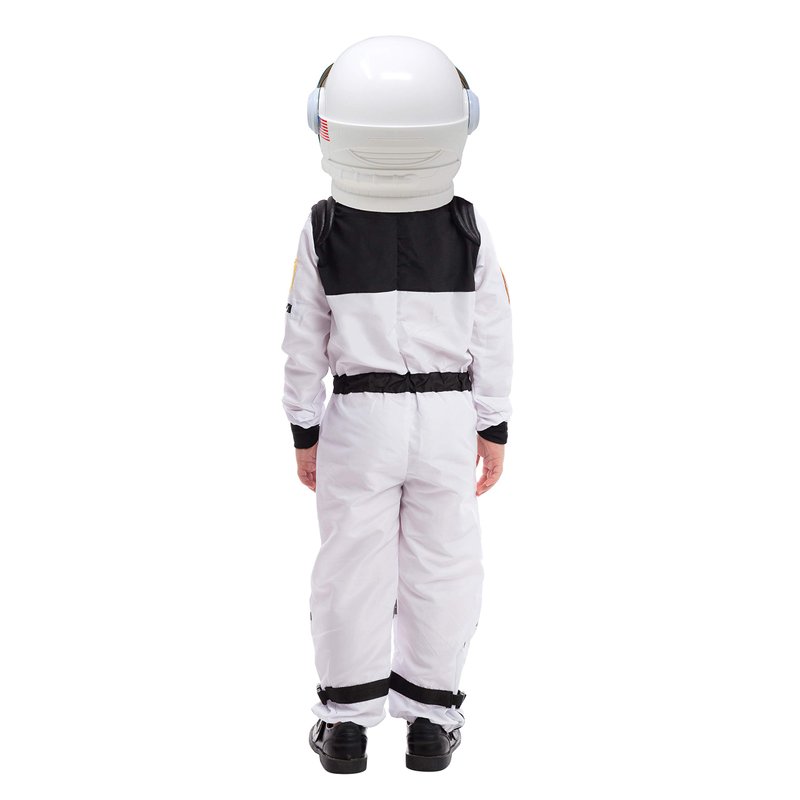 - Astronaut NASA Pilot Costume Includes a White Full-Length Body Jumpsuit with Embroidered NASA Logo and USA Flag Patches and a Tinted Movable Visor Space Helmet.