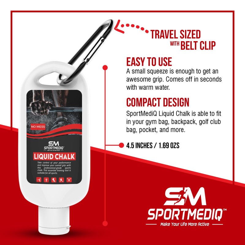 SPORTMEDIQ Pro Grade Liquid Chalk – 1 Pack - Mess Free Professional Hand Grip for Gym, Weightlifting, Rock Climbing, Gymnastics, Rock Climbing - Dries in Seconds - 1.69oz Travel Size with Belt Clip