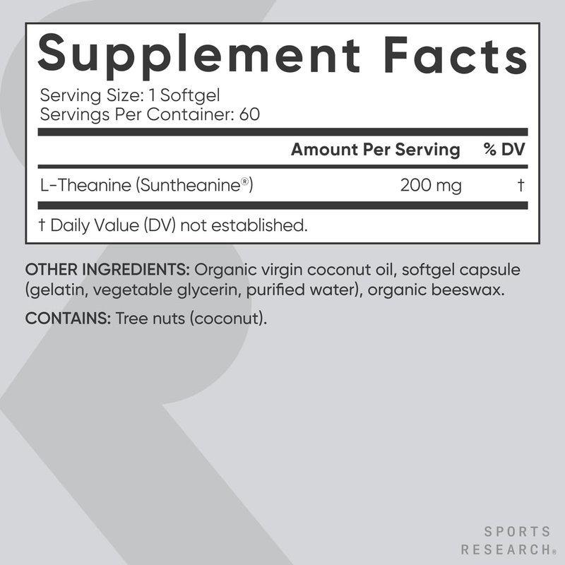 Get ready to take on the day with Sports Research L-theanine—an amino acid commonly found in green tea used to promote relaxation. Our L-theanine supplement, made with patented and clinically researched Suntheanine, offers you all the feelings of focus, alertness, and relaxation without the feeling of a crash, jitters, or drowsiness that often follow caffeine or caffeine pills, energy pills, and energy drinks. Our premium focus supplement formula uses 100% organic coconut oil encapsulated in a convenient once-daily, easily digestible liquid softgel that is IGEN non-GMO tested, cGMP compliant, and gluten, filler and artificial color-free. With over 40 years of innovation in sports nutrition, we are dedicated to helping you perform your best. All Sports Research supplements, vitamins, and performance essentials are research-backed and designed to support all of your wellness goals in finding both your balance and your edge.