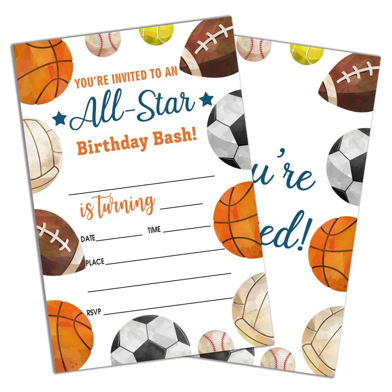 Sports Style Fill-In Birthday Invites(4"x6"), All Star Birthday Invitations with Envelopes(20-Pack), Birthday Party Supplies for Boys & Girls, Teen, Kids-A02