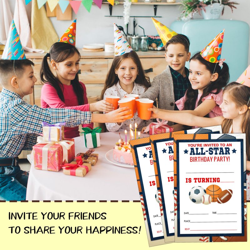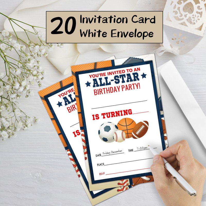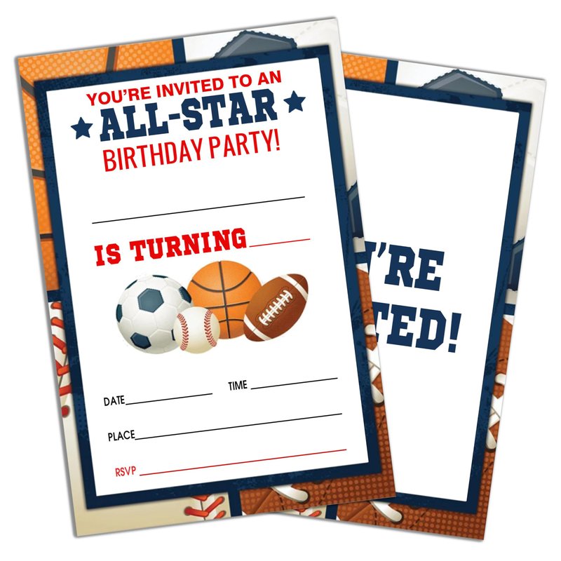 Sports Style Fill-In Birthday Invites(4"x6"), All Star Birthday Invitations with Envelopes(20-Pack), Birthday Party Supplies for Boys & Girls, Teen, Kids-A04