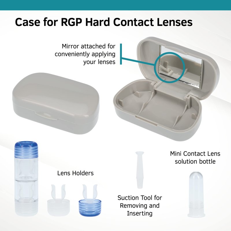 - EXTRAS: Includes a Case for RGP Hard Contact Lenses with screw tops for storing your hard contacts, a Mirror attached for conveniently applying the lenses and a Suction Remover in a mini solution bottle used to remove and put on your contacts.