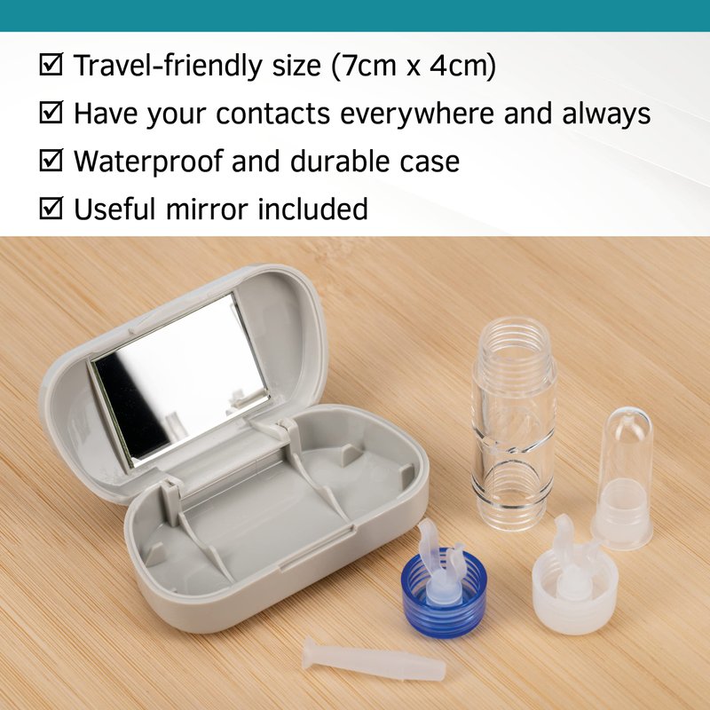 - TRAVEL-FRIENDLY SIZE: Traveling can be stressful enough without any contact lens worries. Sure, you can toss your contact lens case and solution into your travel bags, but having a practical and handy kit accommodating all your contact necessities can save you the unease. Our Travel Kit is small enough to carry in your purse or pocket, but keeps everything together, including a mirror.