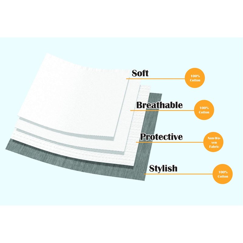 - 4 LAYERS design with 100% cotton outer layers and one non-woven layer. Front layer is a cotton fabric of stylish and popular colors for everyday use. Next layer is a non-woven layer of irregular pattern to help filter particles and to keep the shape of mask from warping. Third layer is 100% cotton with lower thread count. Fourth layer is a skin-friendly soft cotton layer.
