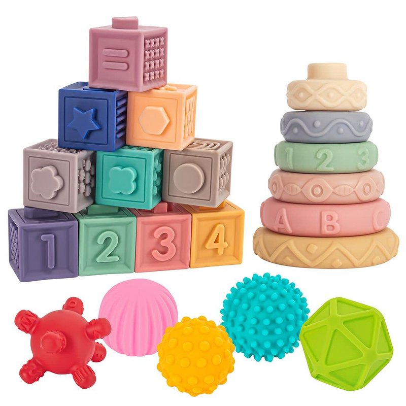 - What's Included?The montessori toys set comes with 12 different color stacking blocks, 6 soft stacking rings, 5 sensory balls that squeeze to make sound.Each building block, which features different bright and enticing colors, has best size for baby's hands,easy for them to pick up and stack.Great sensory toys for 6-12 months old babies.
