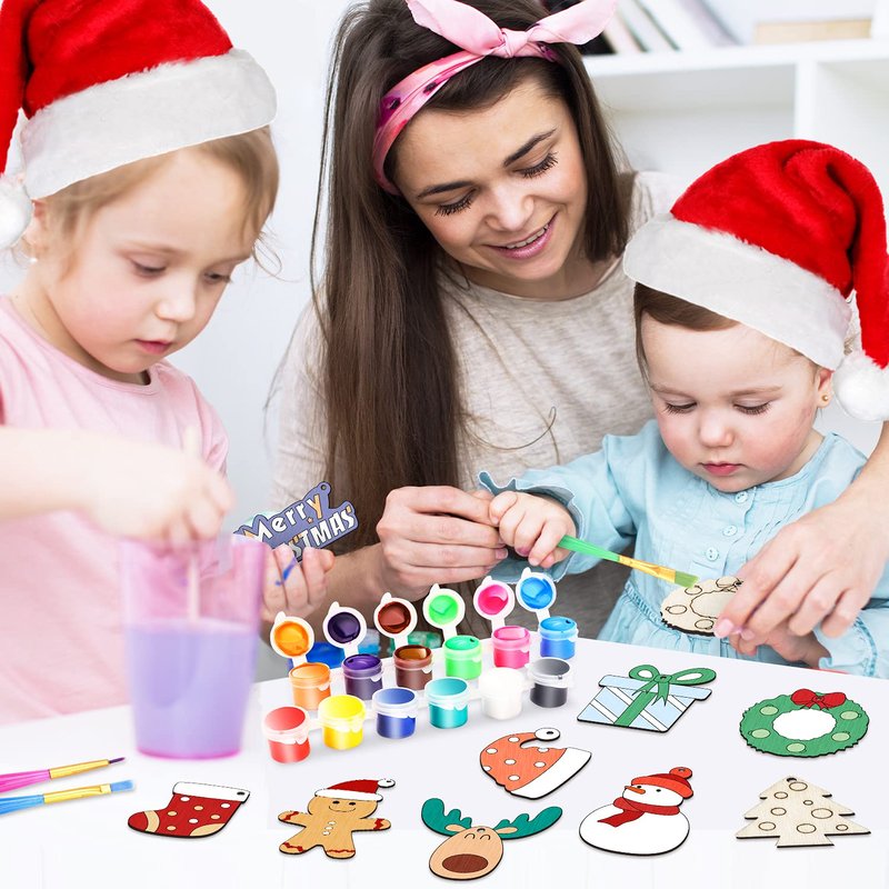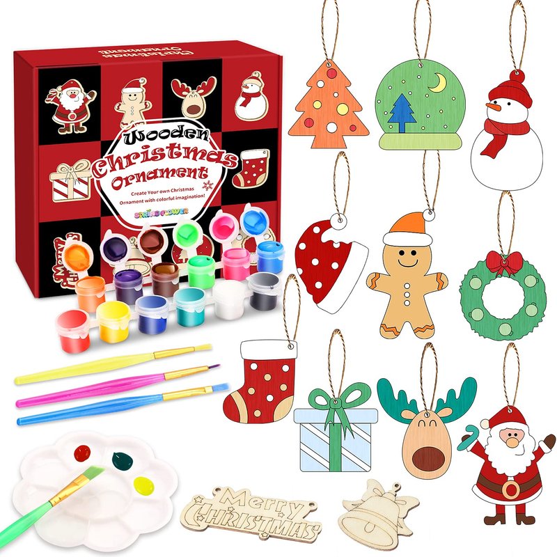 - High-quality Material-The unfinished wood ornaments are made of premium quality natural wood, laser-cut and polished. Both sides are sanded to a smooth finish. The front side with black outline for easy painting, and we leave the backside plain for any write, decorate, or personal creating.Safe and environmentally friendly Christmas gift for kids.