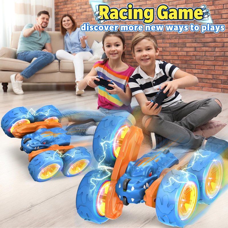 - 【Remote Control Stunt Car with Dinosaur Design】 This RC stunt car features a vivid dinosaur shape and cool lights, making it a unique and exciting toy. Equipped with a remote control, kids can race together, adding a competitive edge to playtime. The car has a maximum range of 40 meters, allowing boys and girls to enjoy speed and action-packed fun.