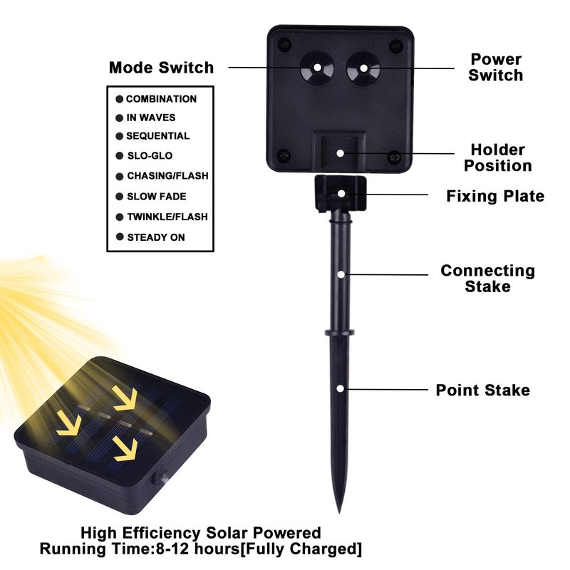 - 8 Lively lighting modes include combination, in waves, sequential, slogs, chasing/flash, slow fade, twinkle/flash, and steady on, creating aesthetic atmosphere for your environment.