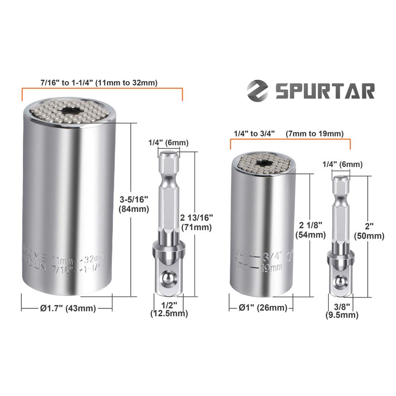 - Professional: Spurtar universal socket fits 7-19mm & 11-32mm (1/4 to 3/4''& 7/16'' to 1-1/4'') nut, bolt, and most irregular shape. This universal socket repairing tool can be used in the automotive industry, household maintenance, manufacturing industry, construction
