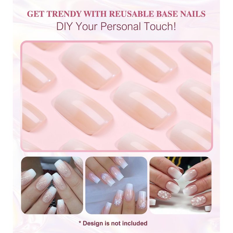 Sqaure Press On Nails Medium - Aegenacess Nude White Ombre Press on Nails, Stick On Nails for Women, Fake Nail with Jelly Stickers, Glue on Nails in 12 Sizes - 24 Nail Kit, Glazed Design