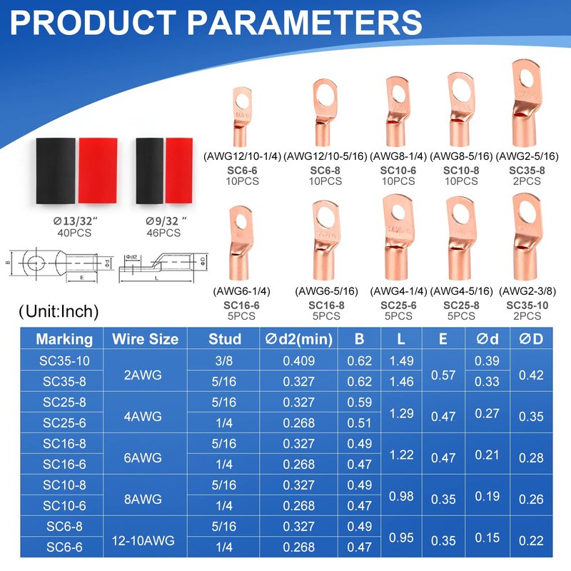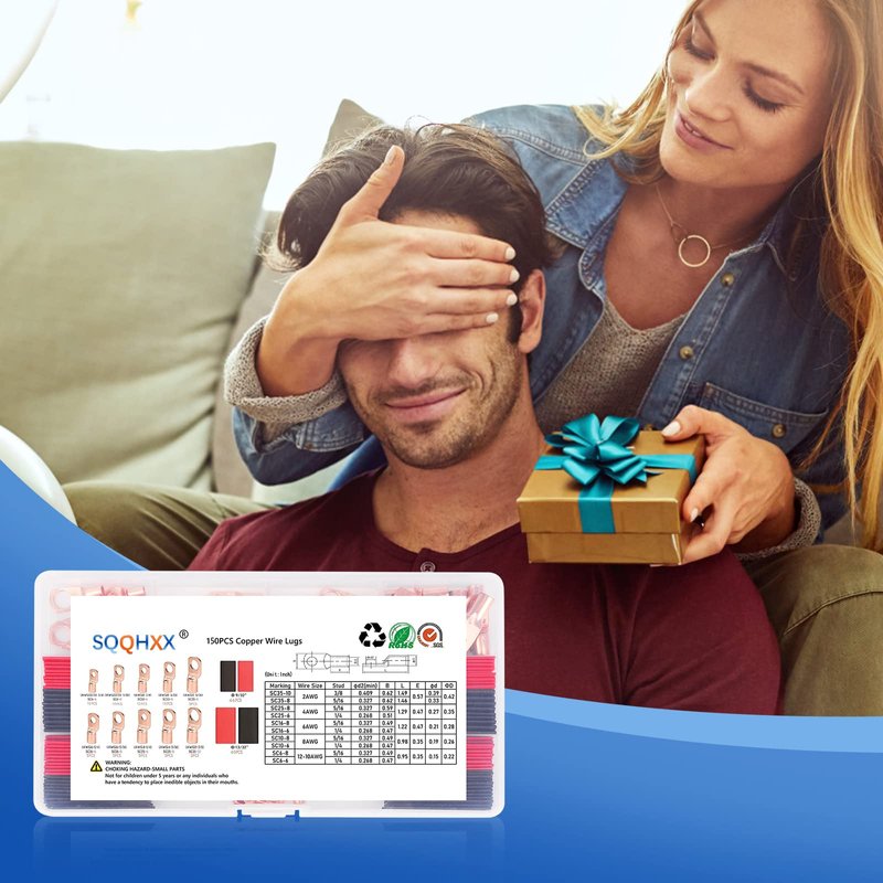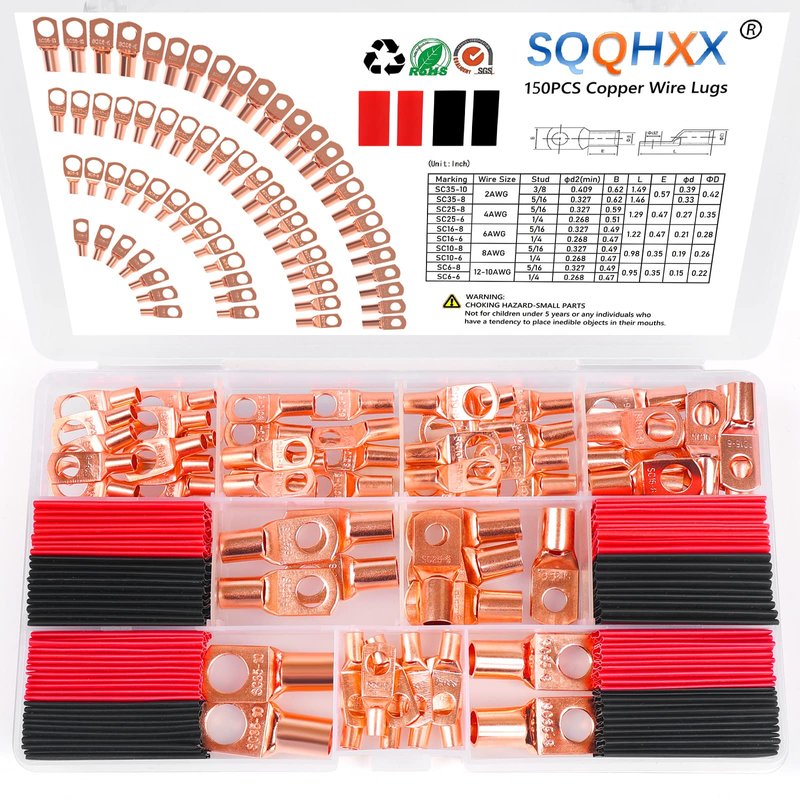 SQQHXX 150Pcs Terminal Connectors,Copper Wire Lugs,Used on AWG12-10 8 6 4 2 Cable,Heat Shrink Set,Bare Copper Eyelets,Ring Terminals Connectors,64Pcs Battery Lugs Ends and 86Pcs Shrink Tubing