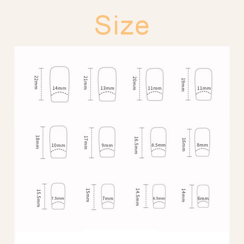 - 【Package & DIY Nails】You'll get 24 false nails in 12 sizes. 1 mini nail file, 1 small wooden stick, 1 piece of adhesive tab glue. You can safely choose a fake nail that fits your finger size and DIY your desired nail shape.