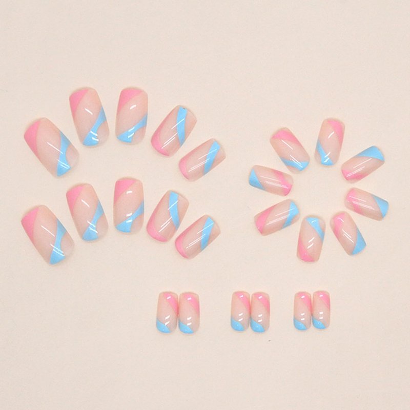 Square Press on Nails Medium Length Fake Nails Blue Pink Irregular Stripe False Nails Design Glossy Full Cover Stick on Nails Natural Glue on Nails Reusable Acrylic Artificial Nails for Women