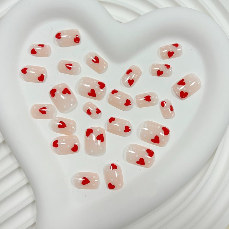 Square Press on Nails Short Fake Nails with Heart Design Nude False Nails Full Cover Acrylic Artificial Nails Glossy Glue on Nails Stick on Nails for Women Manicure Decoration 24Pcs