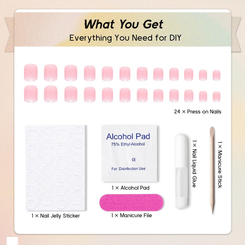 Square Press on Nails Short Ombre Pink Fake Nails Qsnidy French Glossy Acrylic Full Cover False Nails for Women and Girls, Fit Perfectly & Natural Reusable Stick On Nails in 12 Sizes -24 Nails Kit