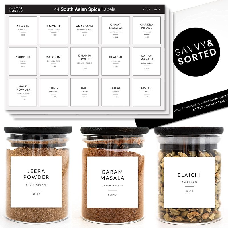 44 SOUTH ASIAN INDIAN SPICE STICKERS LABELS - Designed to fit Savvy & Sorted Bamboo Spice Jars with Bamoo Lid Set