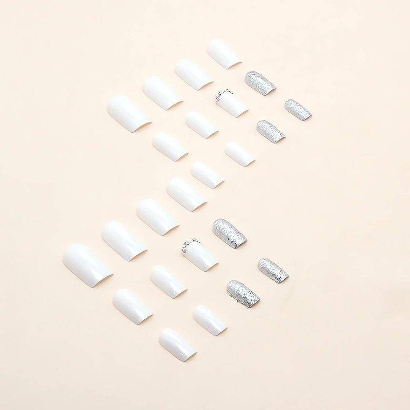Square White Press on Nails Medium Fake Nails with Silvery Glitter Designs Glossy Full Cover Acrylic False Nails with Rhinestones Designs Reusable Glue on Nails for Women 24PCS