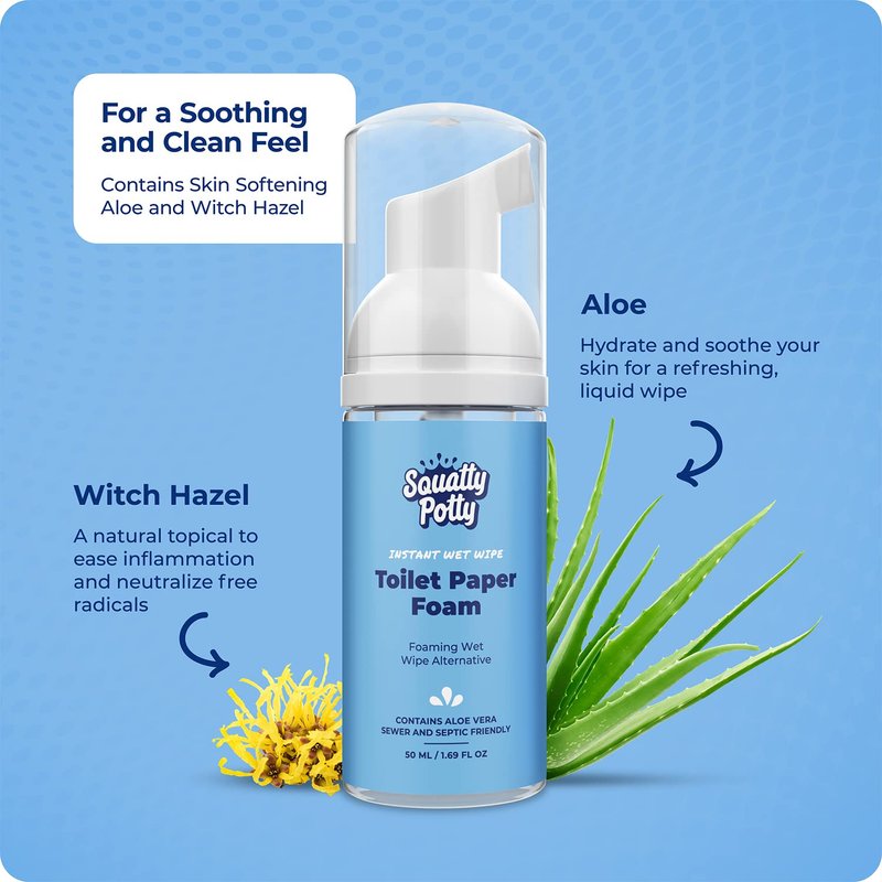 - Reduce Discomfort – Includes skin softening aloe for a gentler liquid wipe than with toilet paper alone. We added witch hazel to our foaming wet wipe alternative to soothe and cleanse your skin.