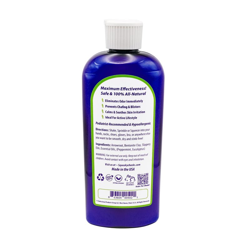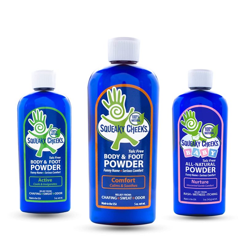 Squeaky Cheeks was invented by a fireman who was frustrated with the current choices on the market. He needed an extreme solution for an extreme job. All alternatives were short lasting and did not prevent blisters and chafing and were ineffective for removing foot odor. This is where Squeaky Cheeks was invented; after months of formulating, he finally came up with an all natural, healthy, and long lasting alternative. Squeaky Cheeks foot and body powder is loved by people from all walks of life such as professional athletes, labor workers, podiatrists, and regular people who sweat just a little more than usual. Talcum based foot powder has been the only choice for decades; it is outdated, inefficient, uncomfortable, ineffective, and can be disastrous to your health! Our talcum free foot powder is a blend of natural ingredients that produces instant results and rigorously outperforms competitors in every imaginable test. Your days of caked-on, squishy powder are over and your feet can finally get the comfort they deserve! Can be used as a shoe deodorizer, one bottle will prevent shoe odor for up to six months. Simply sprinkle a small amount two times a week and never worry about the smell from your shoes again!