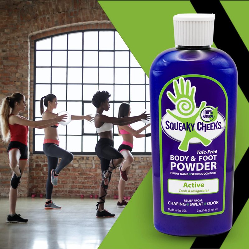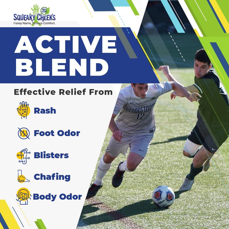 - Will PREVENT BLISTERS, RASH, and CHAFING. Squeaky Cheeks Active Blend is a superior rash powder, and will relieve pain associated with chafing and rash.