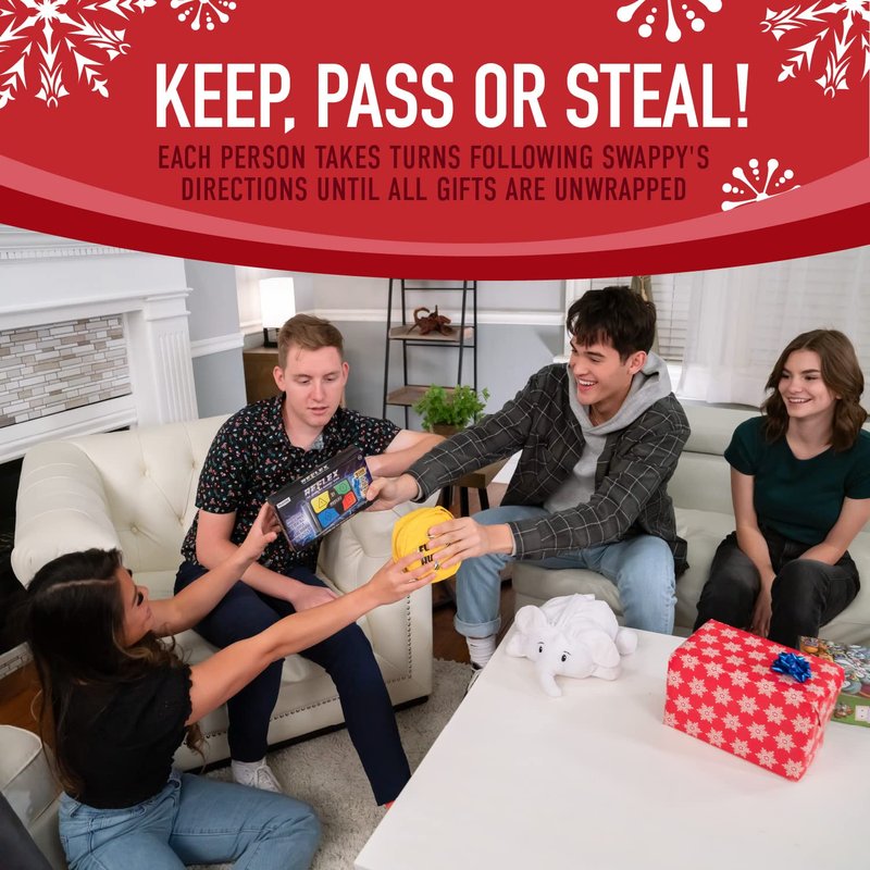 - FUN HOLIDAY GAME WITH A TWIST: Swappy cards will tell you whether to pass, keep or steal gifts, but there's a catch… maybe you'll have to name all the reindeer or sing jingle bells to keep your gift or unwrap. Swappy is full of fun holiday surprises!