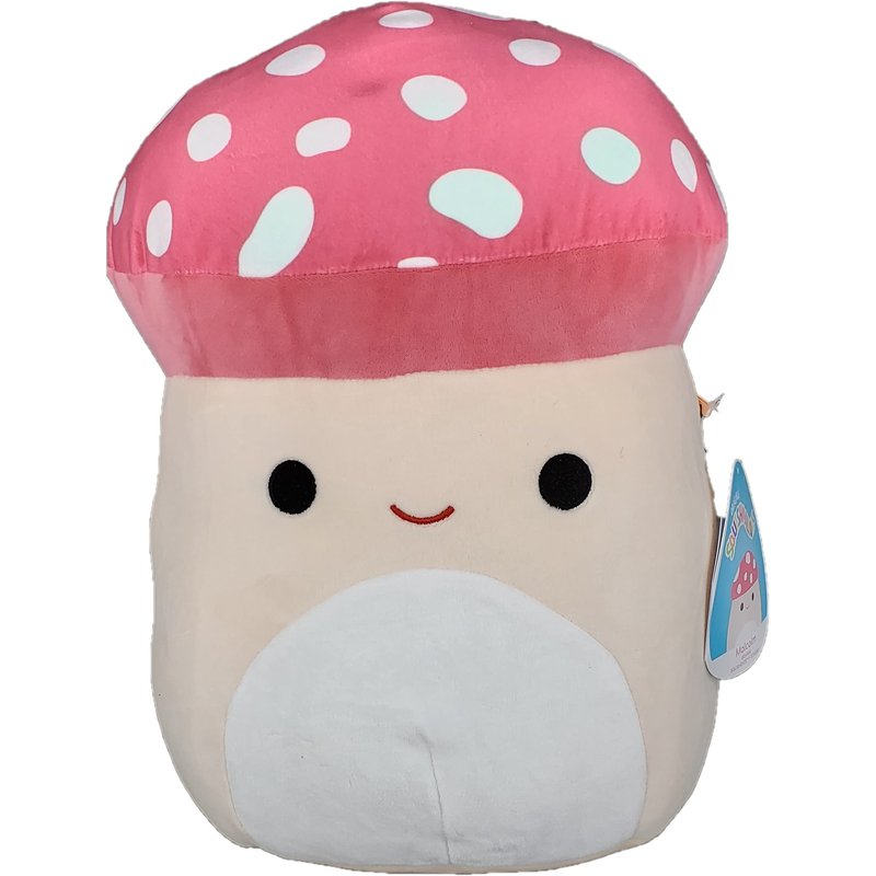Authentic Squishmallow with tags 12 inch Malcolm is a mushroom with a tan stalk and a red cap. The top of his cap is a cool red with white spots, and the underside is a less saturated red. His stalk makes up his body and includes a round, white belly. He has round, black eyes and a red, smiling mouth.