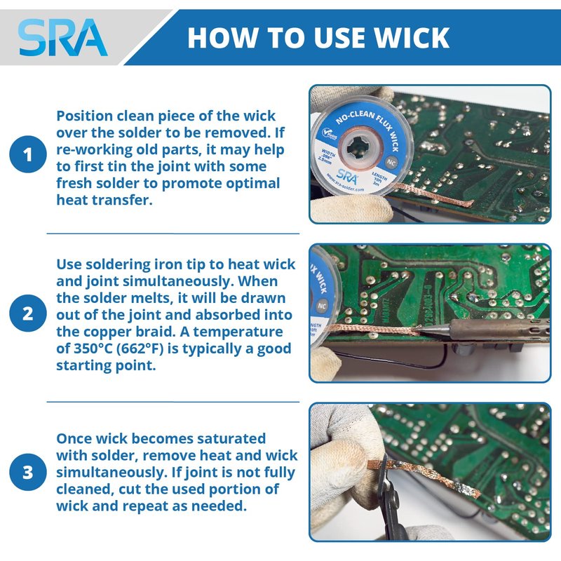 - Easy to Use: Simply place desolder wick over work and apply heat to remove solder from parts and terminals, break solder bridges, and correct other soldering mistakes.