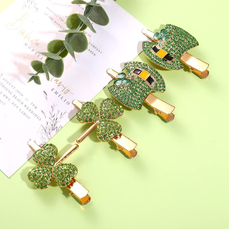 - Happy St. Patrick's Day Hair Clip-- Who said leprechaun's can't get glamorous? With these shiny rhinestone and enamel Leprechaun Top Hat Charm Hairpins , you'll be the flashiest this holiday. These hair clips come with green top hats each sparkling with shamrocks. To avoid being pinched, add a pop of green (and cuteness) through hair accessories and have fun.