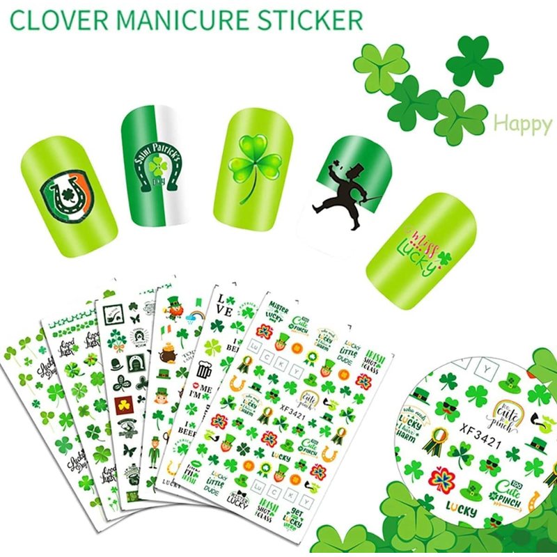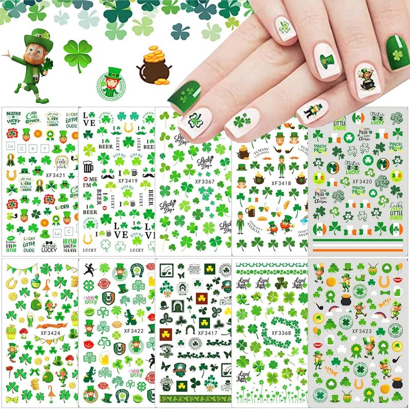- ☘️Nice Combination: you will receive 10 sheets St. Patrick's Day nail art stickers. Shamrocks, Leprechauns, cartoon patterns, luck words and other patterns that are representative of St. Patrick's Day are available.They are well-packed and enough to meet your different needs and for replacement.