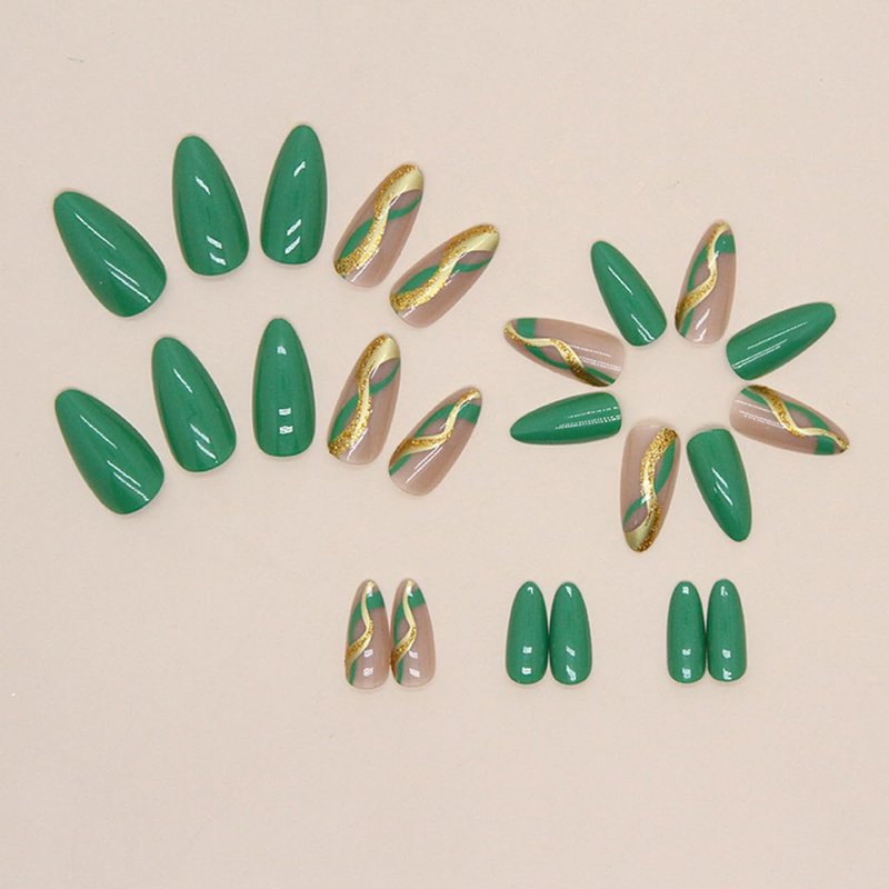 St Patrick's Day Press on Nails Medium Almond - WLGDLH Green Fake Nails Press Ons With Gold Ribbon Designs Fresh False Nails Full Cover Acrylic Nail Kit for Women Manicure 24 PCS