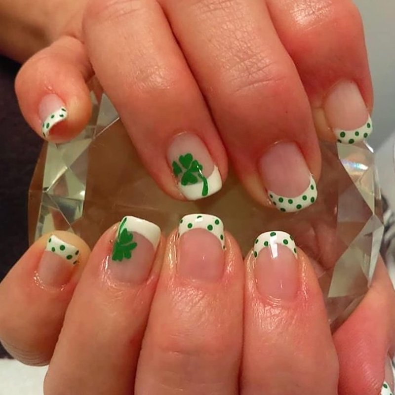 St. Patrick’s Day Press on Nails Short French Tip Fake Nails Green False Nails with Shamrock Designs Acrylic Artificial Nails Lucky March 17th Nail Decorations for Women Girls