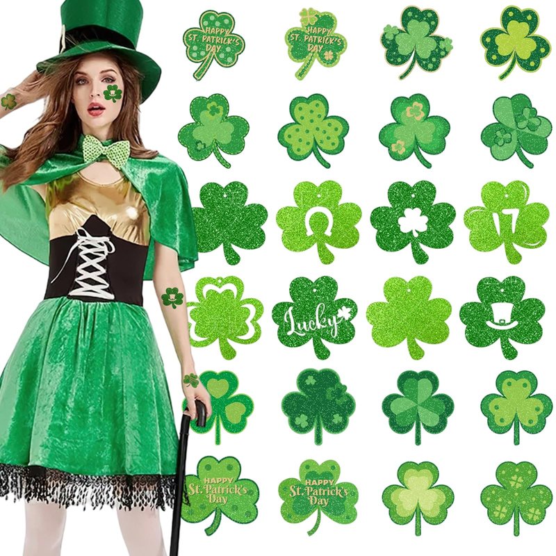St Patricks Day Tattoos Glitter Shamrock Temporary Tattoo Stickers, Waterproof Saint Patricks Day Green Clover Tattoos Face Body Art Make up Deco Irish Party Favors (Medium, Count, 24)