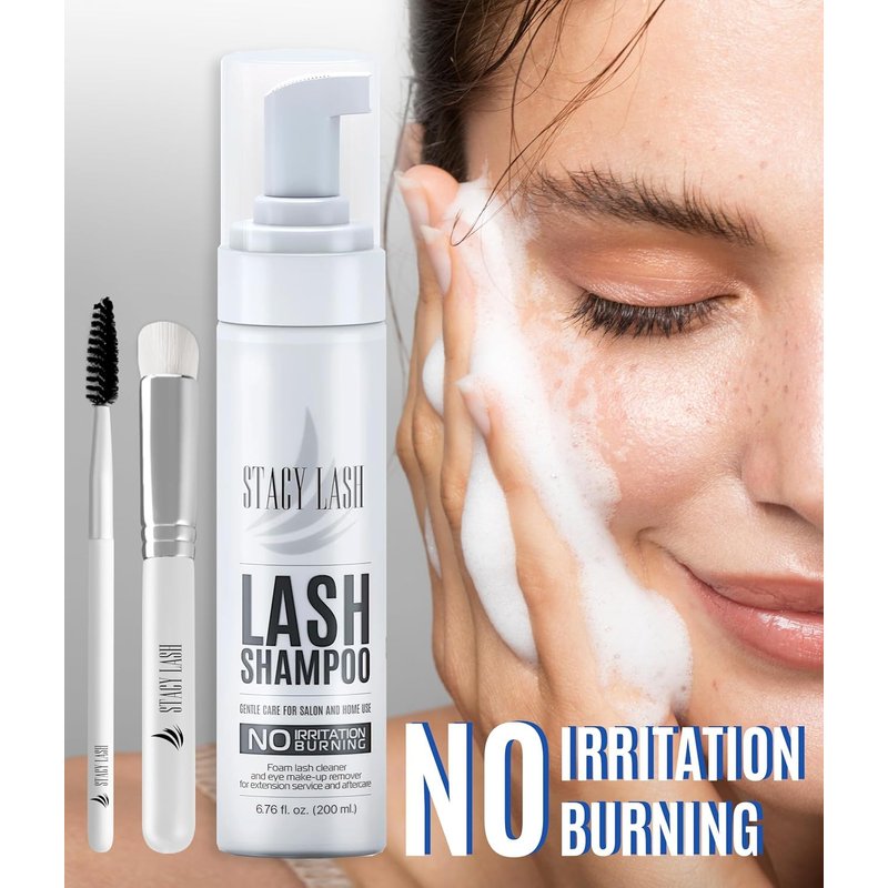 STACY LASH 6.76 fl.oz/200ml Eyelash Extension Shampoo + Brush/Eyelid & Eyebrows Foaming Cleanser/Wash for Extensions & Natural Lashes/Safe Makeup Remover/Supplies for Professional & Home Use