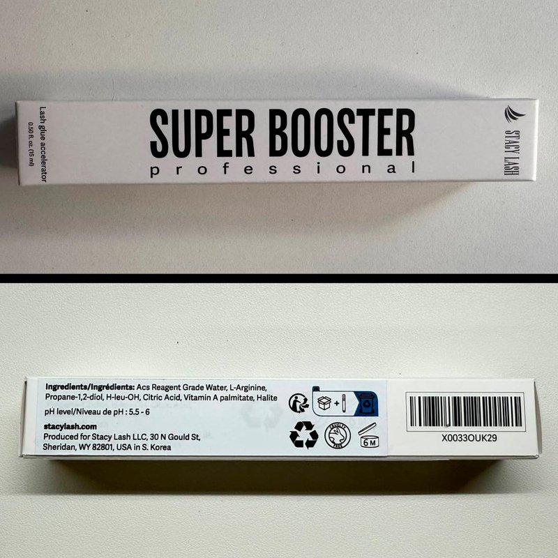 Stacy Lash Super Booster is the new innovative product on the lash market.An absolute must-have item among lash extension supplies for every lash artist who wants to become more professional and be trendy! We are happy to announce that our eyelash glue accelerator will be an indispensable helper in many difficult situations, which lash techs face every day.HOW DOES OUR BOOSTER WORK?When the booster is applied, the lash glue dries up straight away firmly bonding extensions together, which prevents your fans from closing up. Thus, our Super Booster accelerates the curing process of your lash adhesive.As our lash extension glue activator significantly speeds up the bonding time, it could be a great option for your sensitive clients. You can still use milder adhesives without compromising your work speed, as the booster will make them dry much faster.HOW TO USE:Place the necessary amount of product on the base of the eyelash extensions strip. Wait for 30 seconds for it to dry. This will help to prevent your lash fans from closing. You can also use this product after the pre-treatment procedure (after using lash shampoo for lash extensions and eyelash extension primer) by applying our Glue Accelerator to the natural lashes with the help of a micro brush. However, be careful not to overdry your client's natural lashes, as it may lead to retention issues.STORAGE & SHELF LIFE: Store in a cool, dark, and dry place. Use no later than 6 months after opening.CAUTION: Do not leave the product under direct sunlight. Keep out of reach of children and pets. Ingredients: Acs Reagent Grade Water, L-Arginine, Propane-1,2-diol, H-leu-OH, Citric Acid, Vitamin A palmitate, Halite
