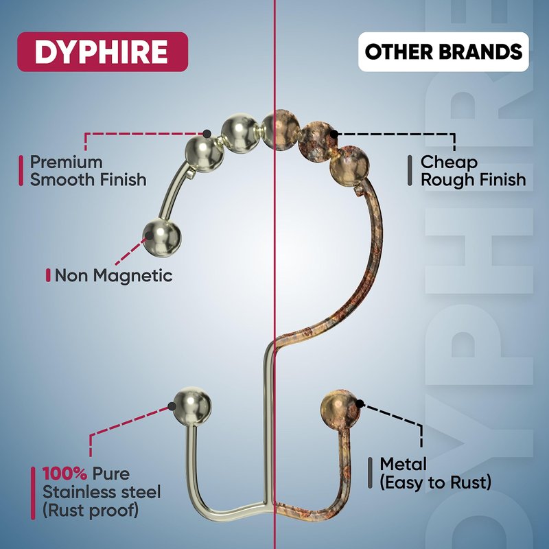Say hello to effortless elegance with Dyphire's set of 12 antler shower curtain rings hoooks. Expertly crafted from 304 stainless steel, these bath shower curtain hooks boast a sleek and sophisticated appearance that will upgrade the look of any bathroom. Friction Free Gliding for a Spa-Like Experience The best shower curtain rings and bath curtain hooks are designed with your comfort in mind, featuring a roller ball design that reduces friction and allows for a smooth gliding action. Say goodbye to stuck or tangled shower curtains, and hello to a spa-like bathing experience.
