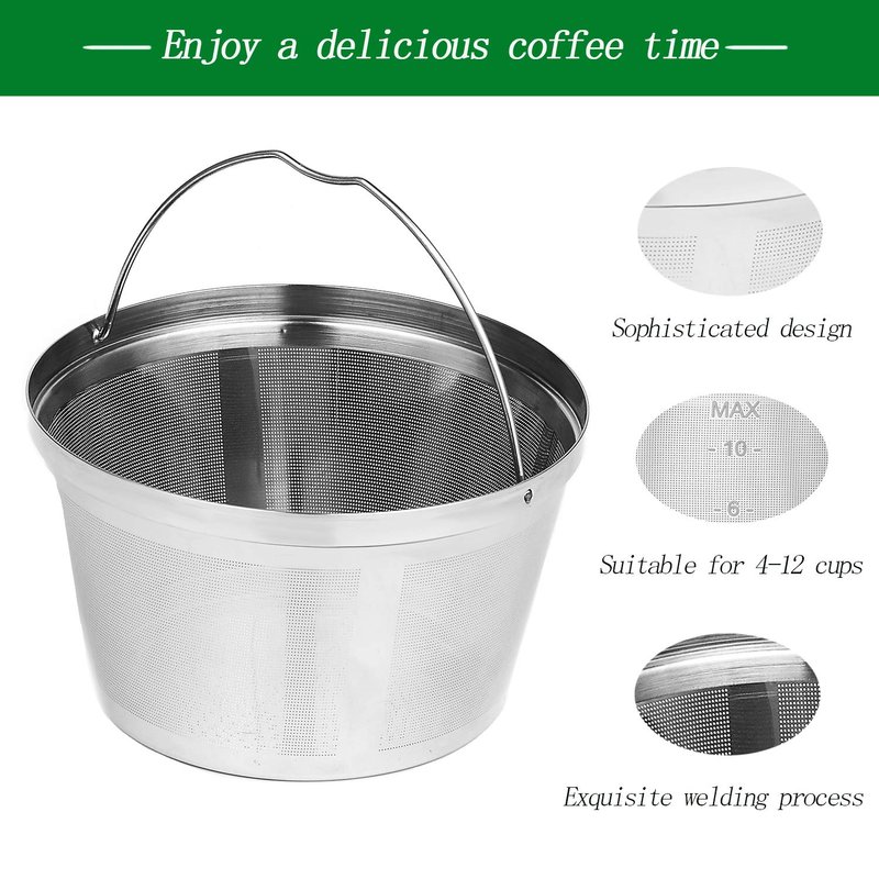 - DOUBLE DELICIOUS: Thanks to the fine mesh of the big coffee filter basket, the coffee powder doesn’t flow out. Keeping the original flavor of the coffee and doesn’t remove the aroma of coffee like paper filtration.Made of Food-grade, 18/8 stainless steel and rejects irritating smell that ensure it’s safe and healthy.