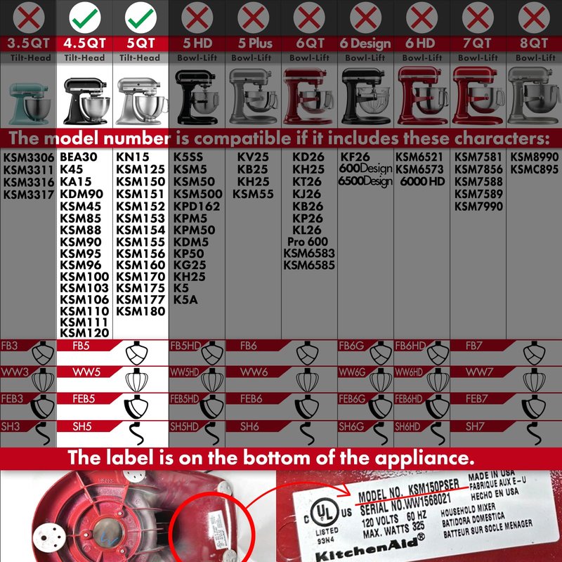 - Note: Compatible with almost all KitchenAid 4.5-quart and 5-quart tilt-head stand mixers. You can find your model on the bottom of the mixer. For a detailed list of compatible models, please refer to our compatibility list on our website. Compatible models include KN15, KSM125, KSM150, KSM151, KSM152, KSM153, KSM154, KSM155, KSM156, KSM160, KSM170, KSM175, KSM177, KSM180, BEA30, K45, KA15, KDM90, KSM45, KSM85, KSM88, KSM90, KSM95, KSM96, KSM100, KSM103, KSM106, KSM110, KSM111, KSM120.