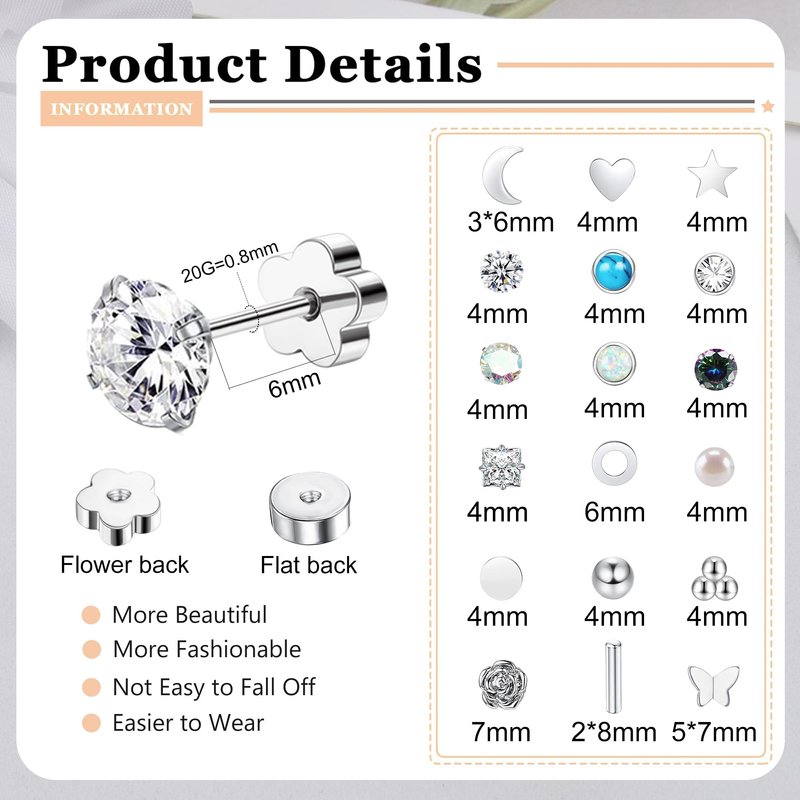 - Hypoallergenic Stud Earrings Set Gauge Size-----The bar thickness of stud earrings is 20G(0.8MM), Post Length mm.Gauge:20G(0.8mm) pin thickness, Post Length:6mm. Pearl/Opal/Ball/Dot/Cubic Zirconia:4MM; flower:7mm, butterfly:5*7mm. Well-fitted and Stackable, A Solid Choice for People Who Have Many Ear Piercings, also Popular as Cartlidge earrings studs.