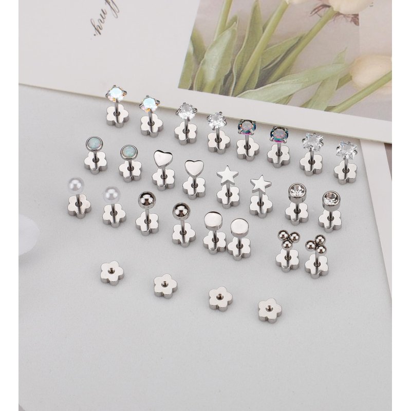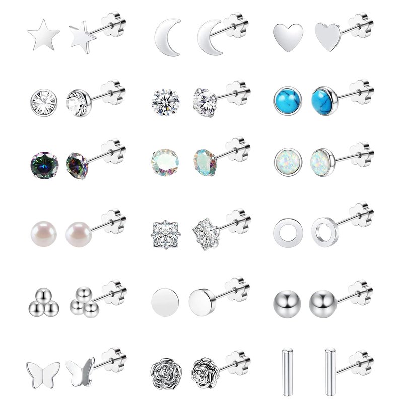 Staligue 18 Pairs Surgical Steel Earrings for Sensitive Ears Opal Pearl CZ Hypoallergenic Flat Back Stud Earrings for Women Men 20G Flower Back Cartilage Earrings Piercing Jewelry (Silver)
